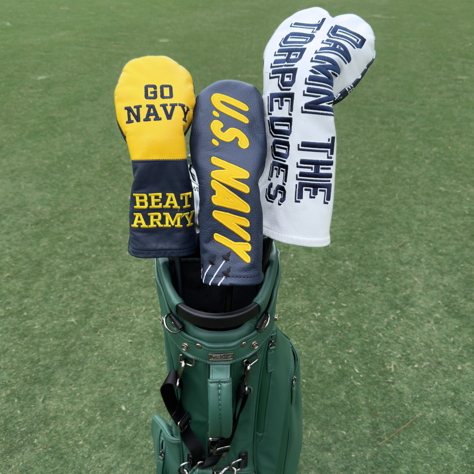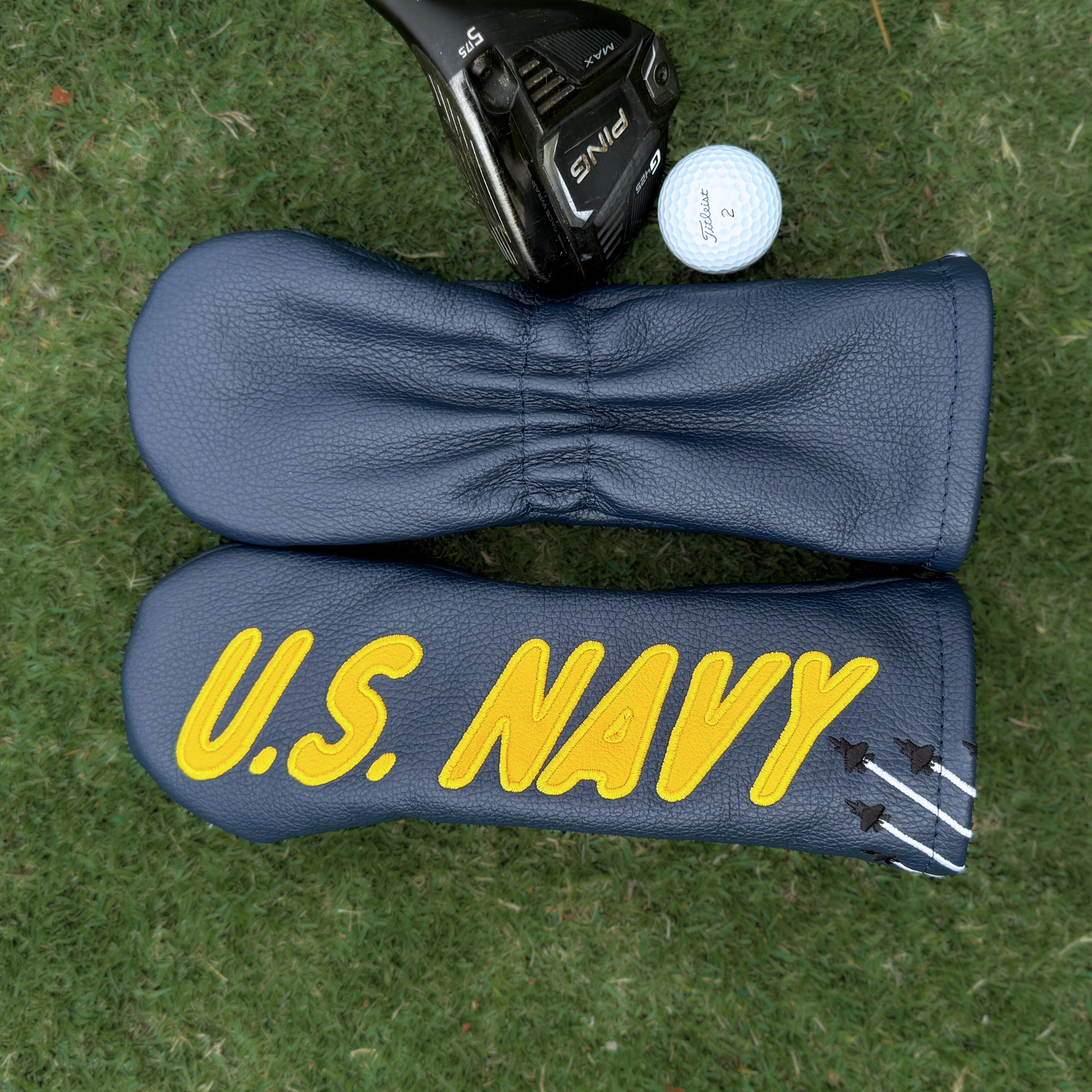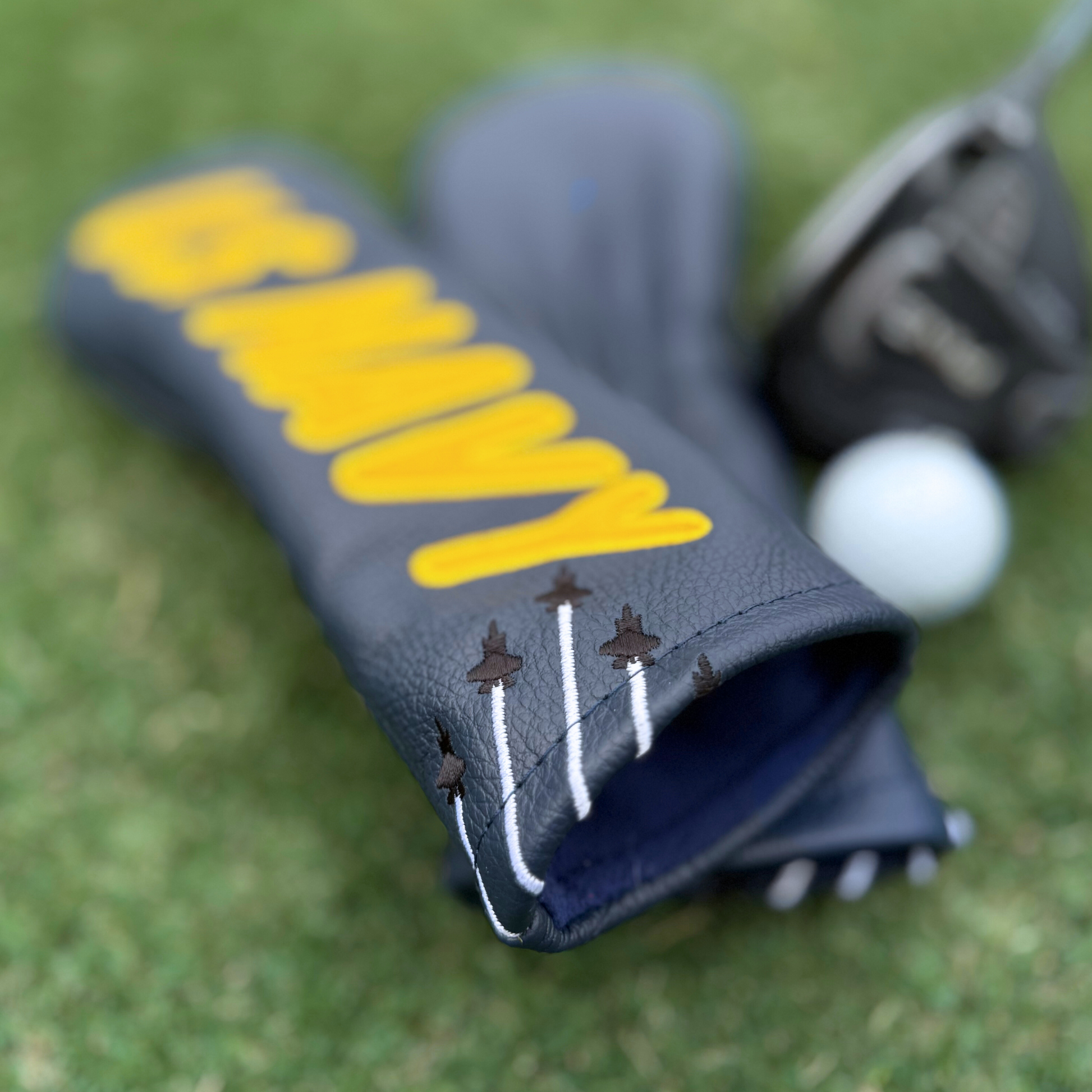 Designed as a bold nod to the U.S. Navy and the legacy of Naval Aviation, this headcover draws directly from the iconic underwing lettering of the Blue Angels. Each “U.S. NAVY” letter is hand-cut from leather and sewn on. Beneath the lettering, a formation of jets is stitched in motion—subtle, but unmistakable. It’s a tribute to the tight formations flown by naval aviators and a symbol of the discipline, excellence, and camaraderie found both in the skies and on the ground.